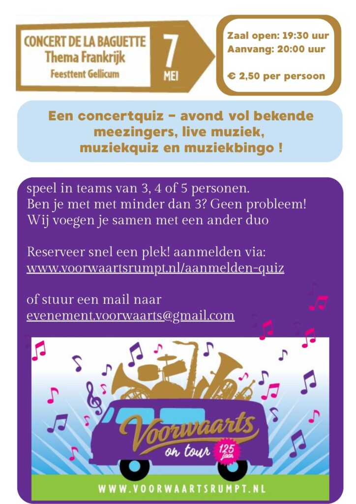 Aanmelden Quiz – Concert de la Baguette Leuk dat je erbij wilt zijn! Meld je hieronder aan. Schakel JavaScript in je browser in om dit formulier in te vullen.Schakel JavaScript in je browser in om dit formulier in te vullen.Naam *VoornaamAchternaamE-mail * Personen E-mail Teamnaam Aantal Personen *Teamnaam *Verzend